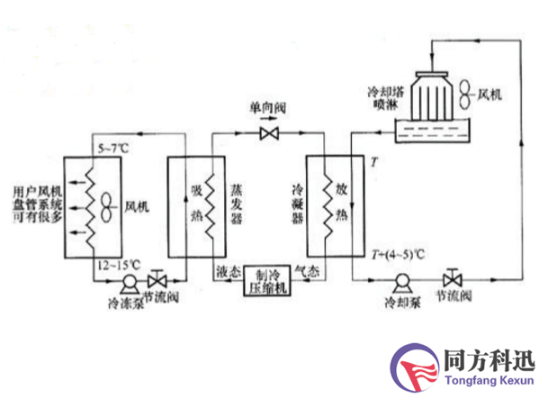 制冷機(jī)通過壓縮機(jī)將制冷劑壓縮成液態(tài)后送蒸發(fā)器中與冷凍水進(jìn)行熱交換,將冷凍水制冷,冷凍泵將冷凍水送到各風(fēng)機(jī)風(fēng)口的冷卻盤管中,由風(fēng)機(jī)吹送達(dá)到降溫的目的。經(jīng)蒸發(fā)后的制冷劑在冷凝器中釋放出熱量成氣態(tài),冷卻泵將冷卻水送到冷卻塔上由水塔風(fēng)機(jī)對(duì)其進(jìn)行噴淋冷卻,與大氣之間進(jìn)行熱交換,將熱量散發(fā)到大氣中去。
