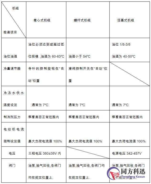 以上,三種常見機組均需如此檢查。另外,需要注意的是,螺桿式機組運轉(zhuǎn)前必須給油加熱器先通電12h,對潤滑油加熱。而活塞式機組正式啟動前必須打開吸排氣閥門,并接通電加熱器,對曲軸箱的潤滑油預加熱24h以上。
