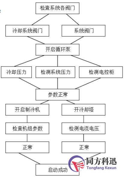 在開啟系統(tǒng)之前首先要檢查系統(tǒng)和冷卻水系統(tǒng)閥門是否處于正常開關(guān)狀態(tài),無誤后開啟循環(huán)泵,檢測(cè)電流、電壓及冷卻水統(tǒng)水壓是否正常。各項(xiàng)參數(shù)正常后,開啟制冷機(jī),檢測(cè)機(jī)組參數(shù),參數(shù)正常后,啟動(dòng)成功。