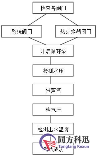 閥門,正常后開啟循環(huán)泵,檢測(cè)壓力,供蒸氣檢氣壓,出水溫度,啟動(dòng)成功。